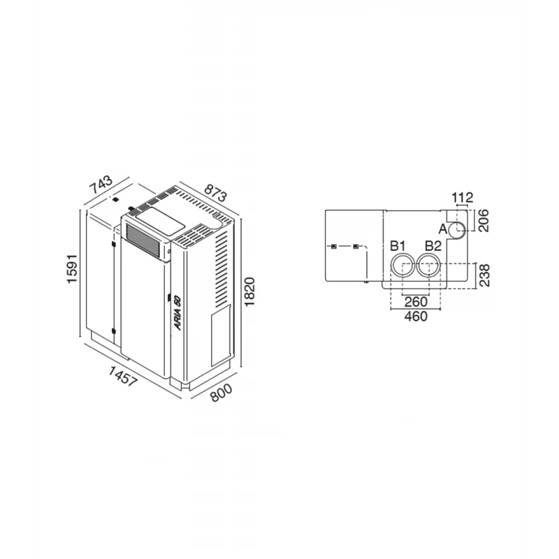 - Sortie d’air chaud frontale (grille) ou supérieure (2 sorties Ø20 cm)